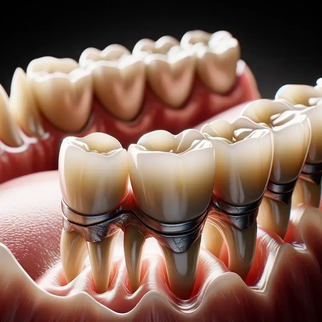 A Maryland bonded bridge, also known as a resin-bonded or winged bridge, is primarily used to replace missing front teeth. It consists of a plastic tooth (pontic) supported by a metal framework with metal wings that bond to the back of adjacent teeth. This type of bridge is ideal for front teeth where the neighboring teeth are healthy and stable.